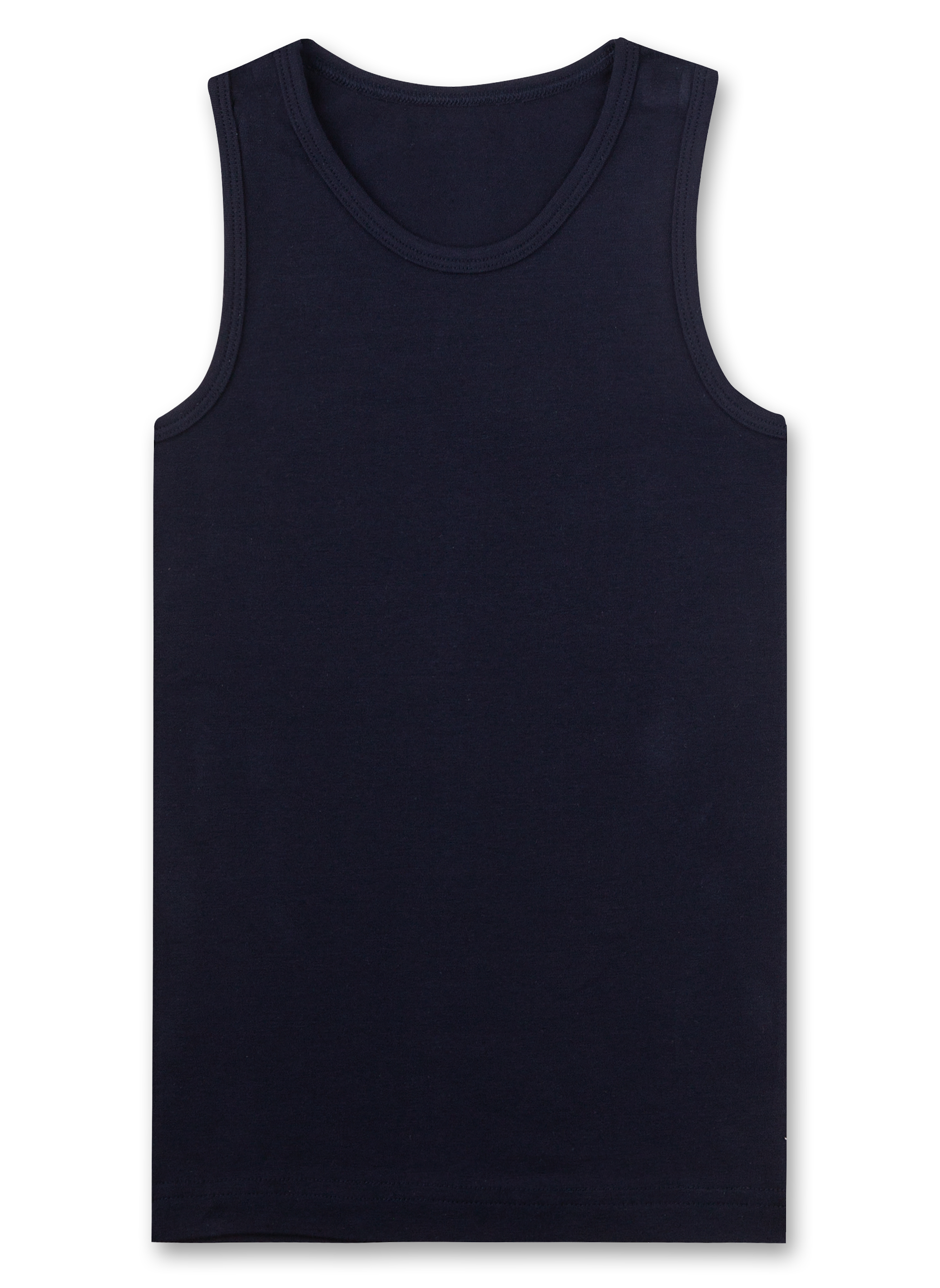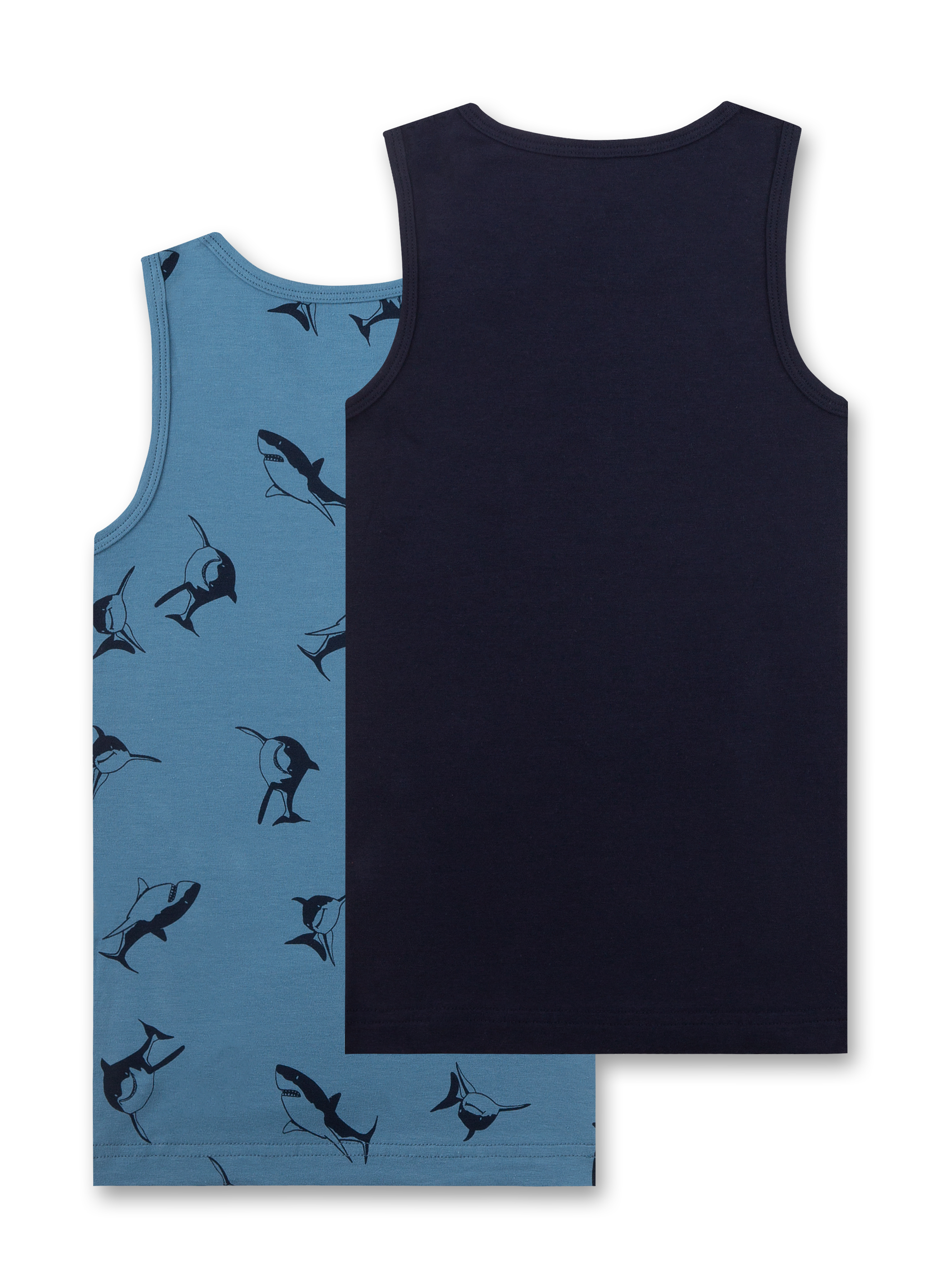 Jungen-Unterhemden von s.Oliver im Doppelpack im coolen Hai-Alloverprint und in Dunkelblau.