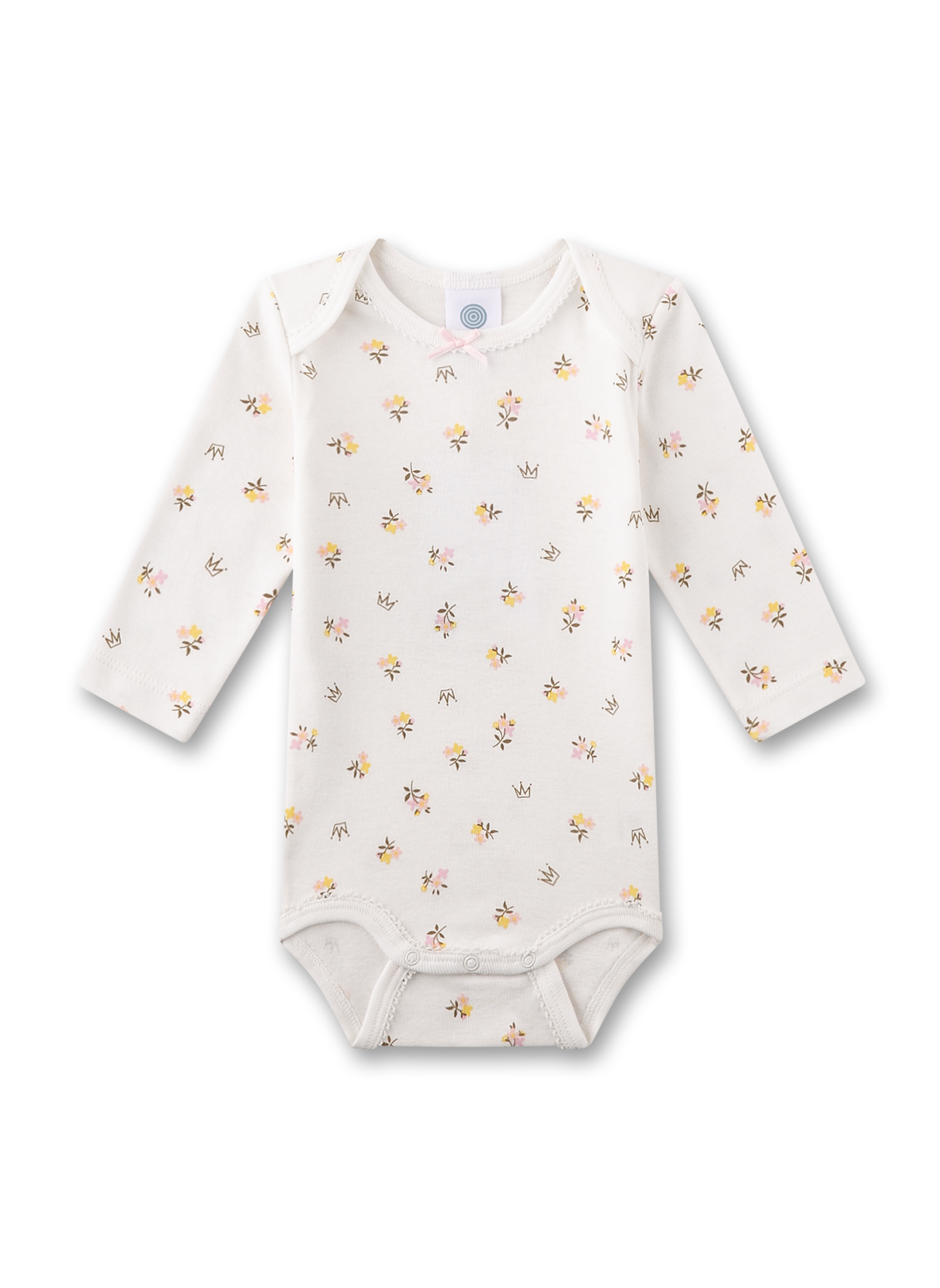 Dieses schöne Doppelpack langärmliger Baby-Bodys besticht durch erstklassige Qualität und liebevolle Akzente. Die feine Feinripp-Qualität aus 100 % GOTS-zertifizierter Bio-Baumwolle ist besonders weich und schmiegt sich sanft an zarte Babyhaut, sodass hoher Tragekomfort garantiert ist. Das verspielte Allovermuster aus kleinen rosa und gelben Blüten, filigranen Blättern und stilisierten Kronen sorgt für einen charmanten Look. Feine Details wie eine kleine Schleife und eine zarte Spitzenkante am Ausschnitt setzen besondere Highlights. Der klassische Schnitt mit amerikanischer Schulter erleichtert das An- und Ausziehen und bietet gleichzeitig angenehme Bewegungsfreiheit. Pflegeleicht und trocknergeeignet, sind diese Bodys perfekte Begleiter für den Alltag.