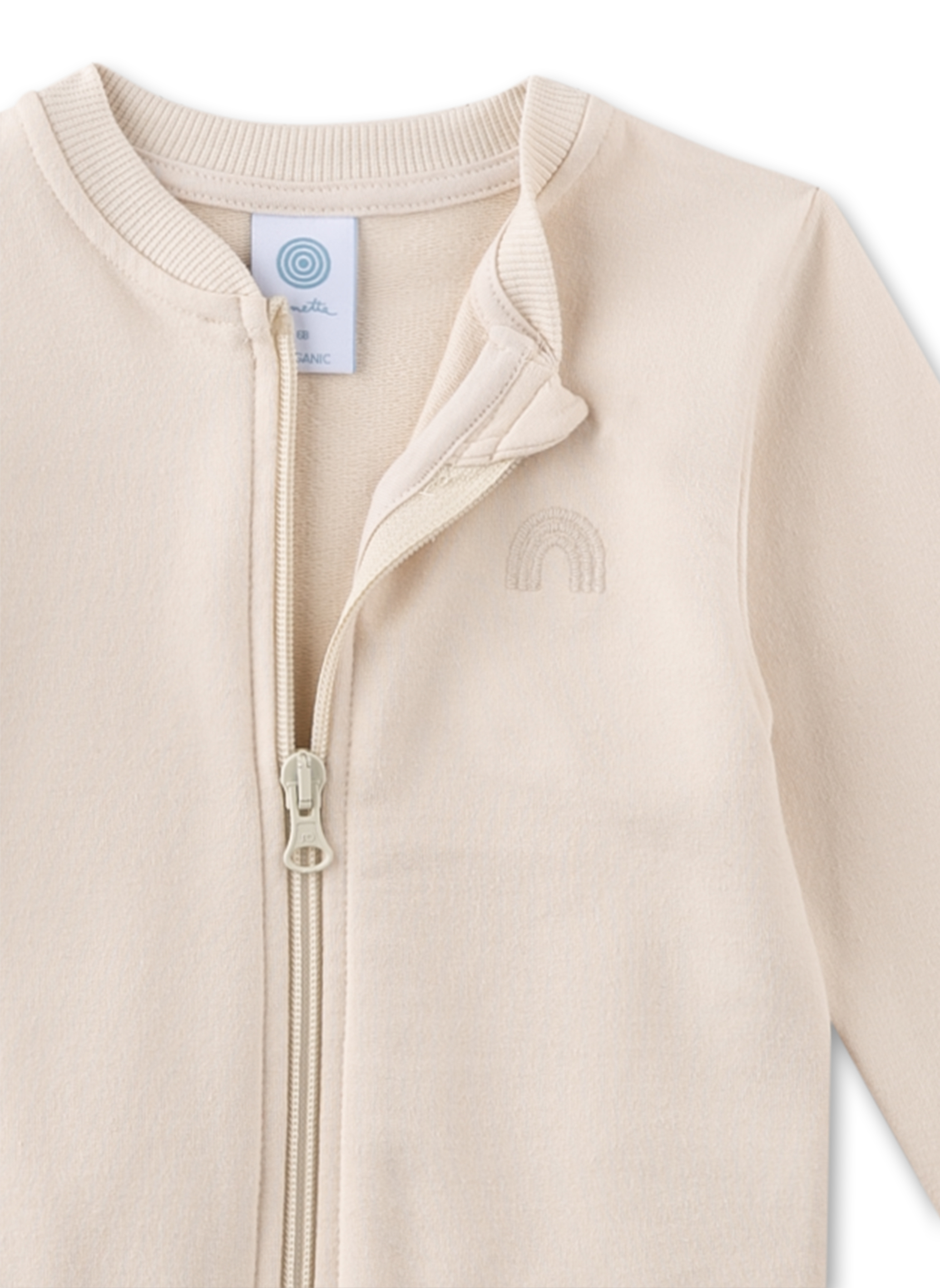 Die Baby-Sweatjacke von Sanetta ist in einem hellen Cremeton gehalten und besticht durch ein schlichtes, zeitloses Design. Sie verfügt über einen durchgehenden Reißverschluss und feine Rippbündchen an Ärmeln und Saum, die für einen angenehmen Sitz sorgen. Auf der linken Brust setzt eine kleine, ton-in-ton gestickte Regenbogen-Applikation ein dezentes Highlight. Das weiche Velours-Feinfutter aus 95% Bio-Baumwolle und 5% Elasthan schmiegt sich sanft an die empfindliche Kinderhaut. Minimalistisch, vielseitig kombinierbar und komfortabel – ideal für kleine Abenteurer im Alltag.