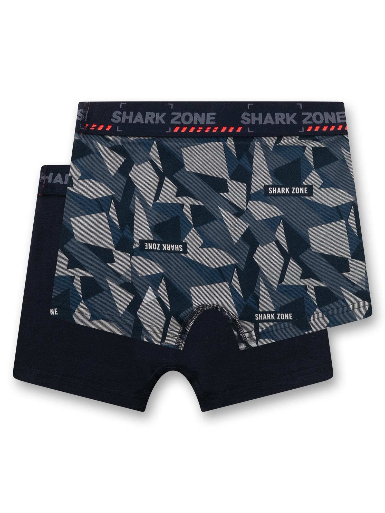 Dieses coole Doppelpack Jungen Hipshorts aus Single Jersey mit 95 % Baumwolle und 5 % Elasthan ist weich, elastisch und angenehm anschmiegsam. Eine Short ist unifarben in Dunkelblau, die andere begeistert mit einem geometrischen Allover-Print in verschiedenen Blautönen und dem auffälligen Schriftzug „SHARK ZONE“. Beide Shorts haben einen elastischen Webbund mit kontrastreichem Schriftzug, der für sicheren Sitz und sportlichen Look sorgt. Perfekt für aktive Jungs und den Alltag.