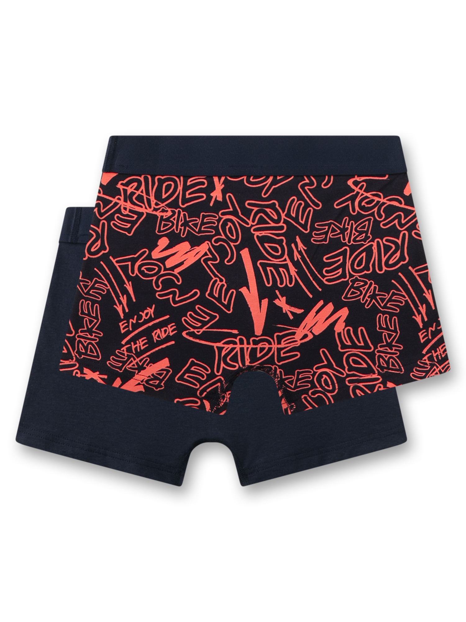Diese Doppelpack Jungen Hipshorts aus Single Jersey mit 95 % Baumwolle und 5 % Elasthan – weich, elastisch und besonders bequem. Eine Short ist unifarben Dunkelblau, die andere überzeugt mit einem auffälligen, grafischen Allover-Print in Neonorange auf Dunkelblau. Dynamische, handschriftliche Schriftzüge wie „RIDE“ und „BIKE“ verleihen den Shorts einen sportlichen, modernen Look. Beide Modelle haben einen elastischen, angenehm weichen Bund für sicheren Sitz und hohen Tragekomfort.