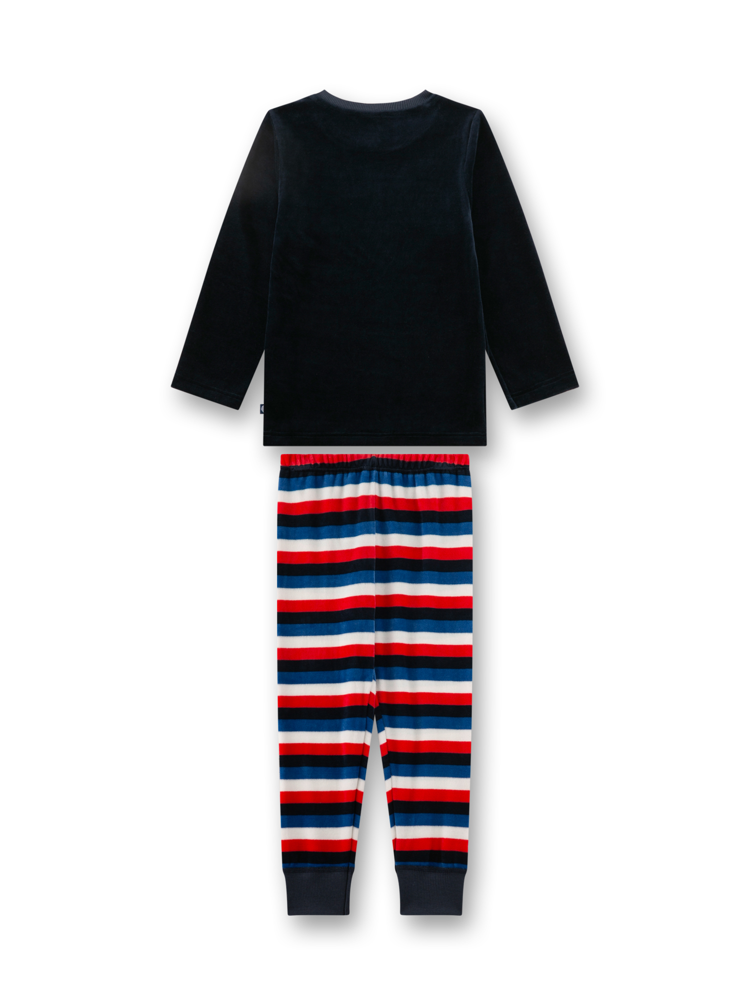 Dieses Jungen-Schlafanzug-Set von Sanetta besteht aus einem langärmligen Oberteil und einer passenden Hose aus weichem Nicki-Stoff (80% Baumwolle, 20% Polyester). Das schwarze Oberteil zeigt ein kleines, rotes Feuerwehrauto auf der Brust und sorgt so für einen fröhlichen Hingucker. Die Hose ist mit breiten Querstreifen in Rot, Weiß und Dunkelblau gestaltet und verfügt über elastische Bündchen an den Beinabschlüssen, die für sicheren Sitz und Bewegungsfreiheit sorgen. Das kontrastreiche Design wirkt lebendig, modern und verspielt – ideal für kleine Fans von Einsatzfahrzeugen.