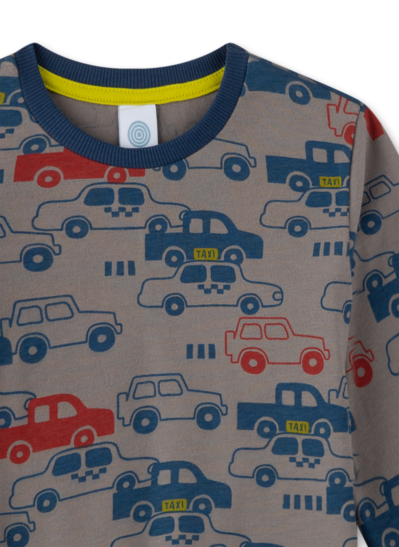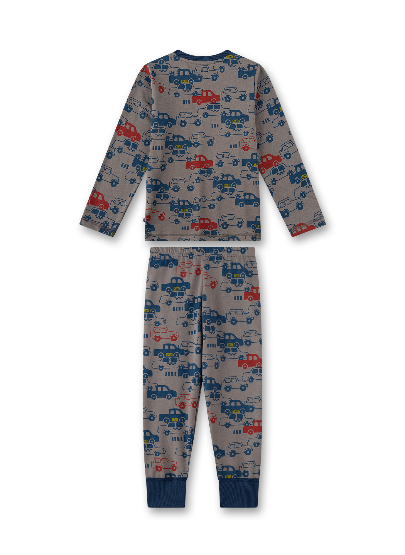Bequemer Schlafanzug in Grau für Jungs von Sanetta mit einem coolen Auto-Allover in verschiedenen Farben.