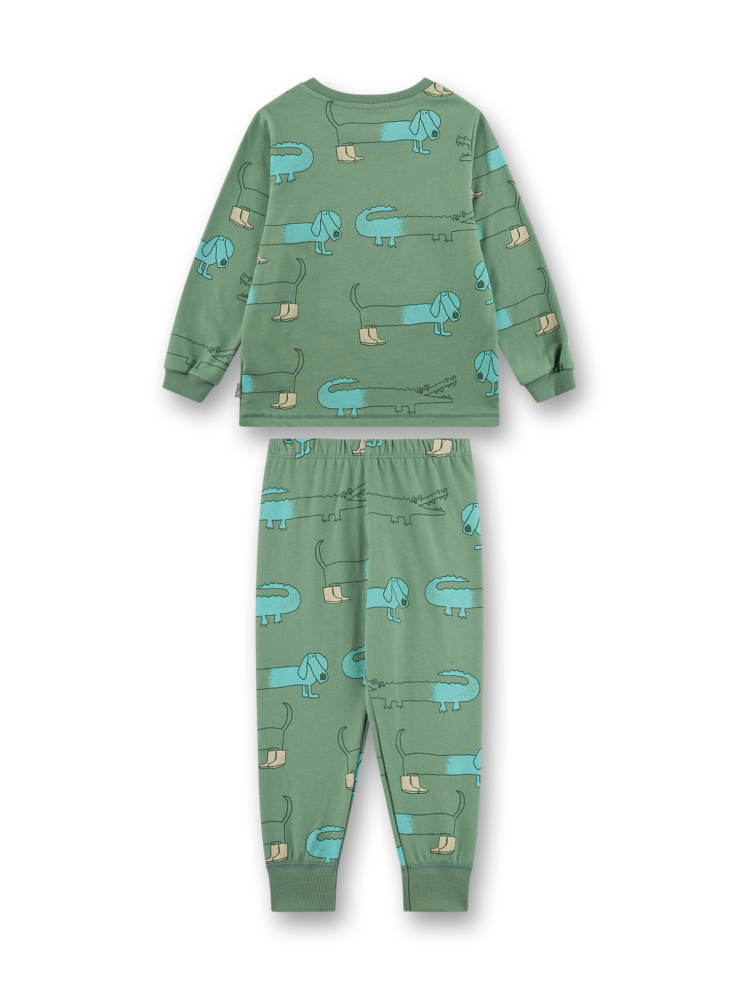 Dieser witzige Jungen-Schlafanzug aus 100 % weicher Baumwolle in Velours-Single-Qualität verbindet Komfort mit verspieltem Design. Das Set in angenehmem Grünton wird von einem kreativen Alloverprint aus Dackeln und Krokodilen geschmückt: Beim Krokodil ist der hintere Teil Türkis, vorne Grün; beim Dackel ist der hintere Teil Grün, vorne Türkis - ein echter Hingucker für kleine Tierfans. Das Oberteil mit langen Ärmeln und die gemütliche Hose mit elastischem Bund und Rippbündchen garantieren bequemen Sitz und Bewegungsfreiheit. Das hautfreundliche Material sorgt für ein angenehmes Tragegefühl und kuschelige Wärme. Ein Schlafanzug, der Spaß und Geborgenheit kombiniert.
