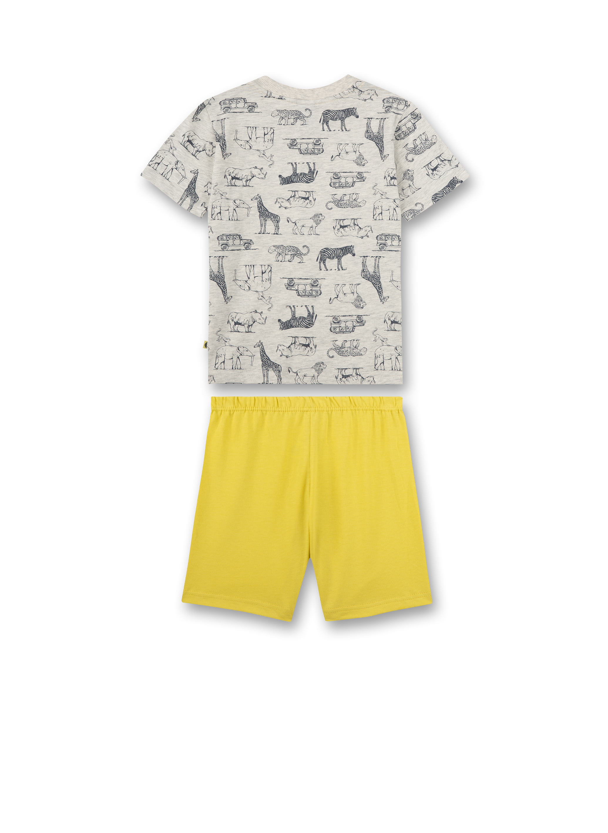 Kurzer Jungen-Schlafanzug mit tierisch gestaltetem Oberteil und farblich passender Hose in Gelb.