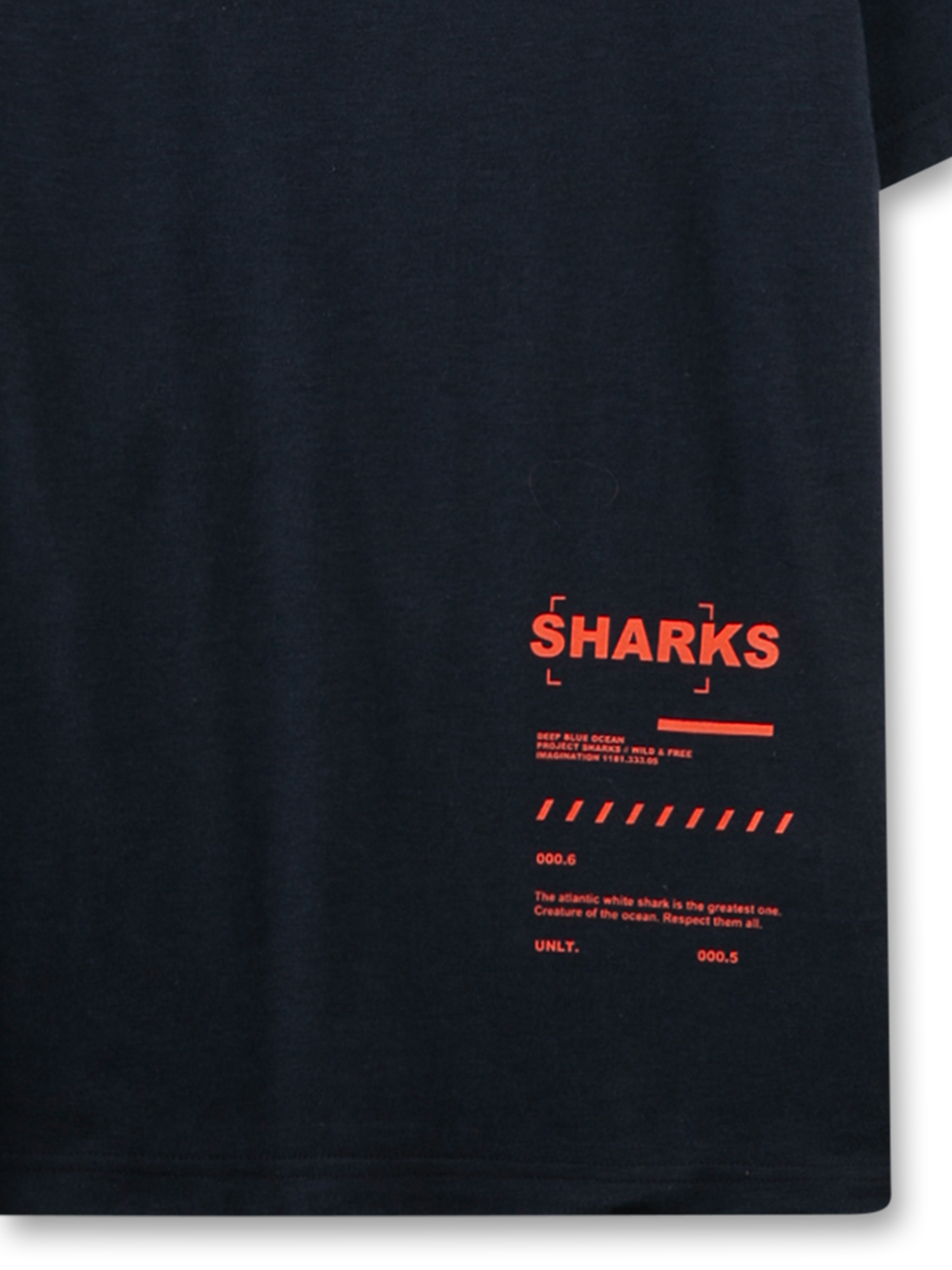 - Oberteil: kurzärmelig, dunkelblau, mit auffälligem orangenen „SHARKS“-Schriftzug und dekorativen grafischen Elementen auf der Vorderseite unten links