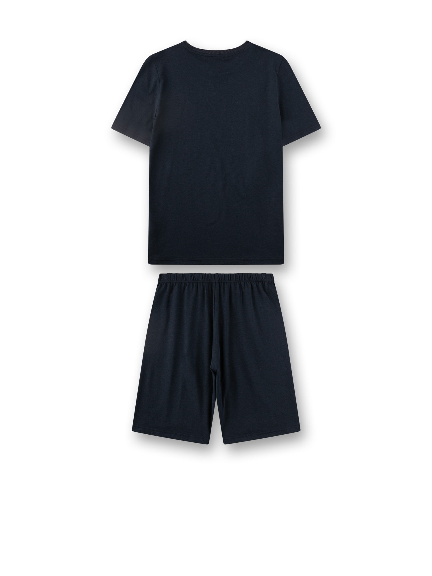 Dieser zweiteilige Jungen-Schlafanzug besteht aus Single Jersey in Rippenstruktur mit 95 % Baumwolle und einem Rest Elasthan und ist angenehm weich sowie elastisch. Das kurzärmelige Oberteil ist dunkelblau und zeigt auf der Vorderseite unten links einen auffälligen orangenen „SHARKS“-Schriftzug mit dekorativen grafischen Elementen. Die passende dunkelblaue Shorts ist knielang, schlicht gestaltet und verfügt über einen bequemen, elastischen Bund, der für optimalen Sitz sorgt.