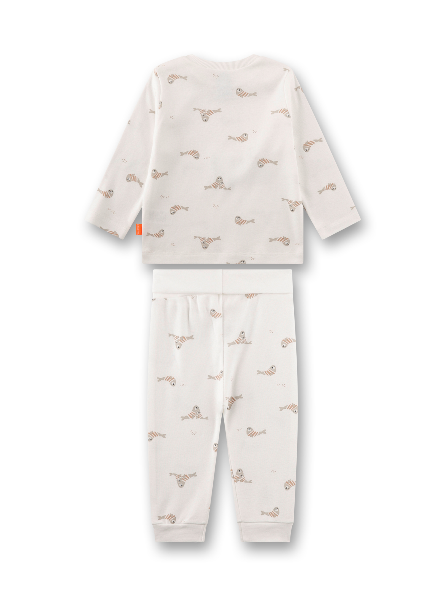 Dieser entzückende Jungen-Schlafanzug von Sanetta ist perfekt für kleine Träumer. Gefertigt aus feinem Rippstoff aus 100 % GOTS-zertifizierter Bio-Baumwolle bietet er ein besonders weiches und hautfreundliches Tragegefühl. Das off-whitefarbene Oberteil begeistert mit einem liebevollen Robben-Motiv, während die passende Hose mit einem harmonischen Robben-Allover verzaubert. Ein weicher Umschlagbund und elastische Beinbündchen sorgen für optimalen Sitz und Bewegungsfreiheit. Dank der praktischen Druckknöpfe an der Schulter gelingt das An- und Ausziehen mühelos. Pflegeleicht, trocknerbeständig und wunderbar gemütlich.