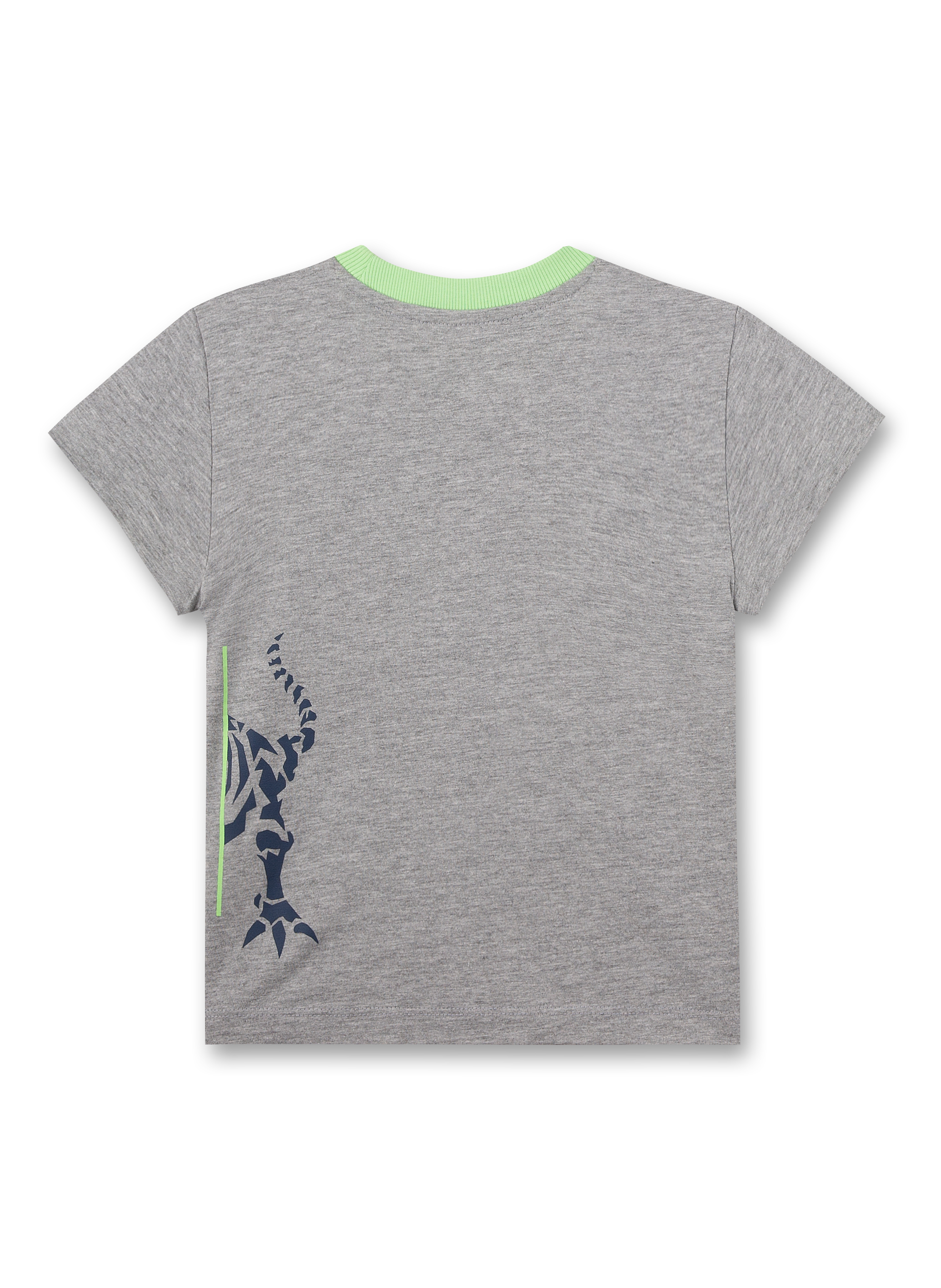 Stilsicheres T-Shirt für Jungen in Graumelange mit grünem Halsausschnitt-Akzent und einem auffälligen Dino-Artwork-Print auf Vorder- und Rückseite.