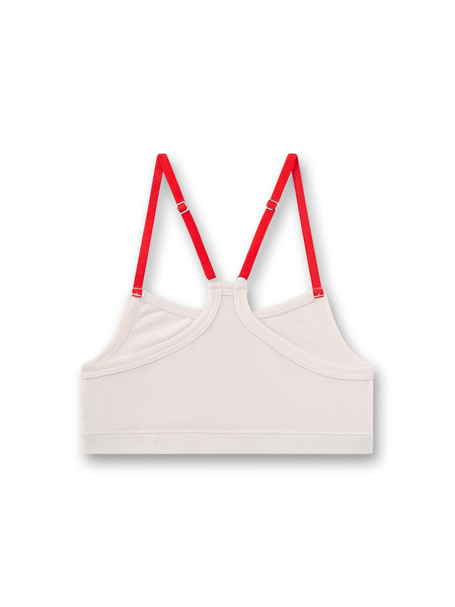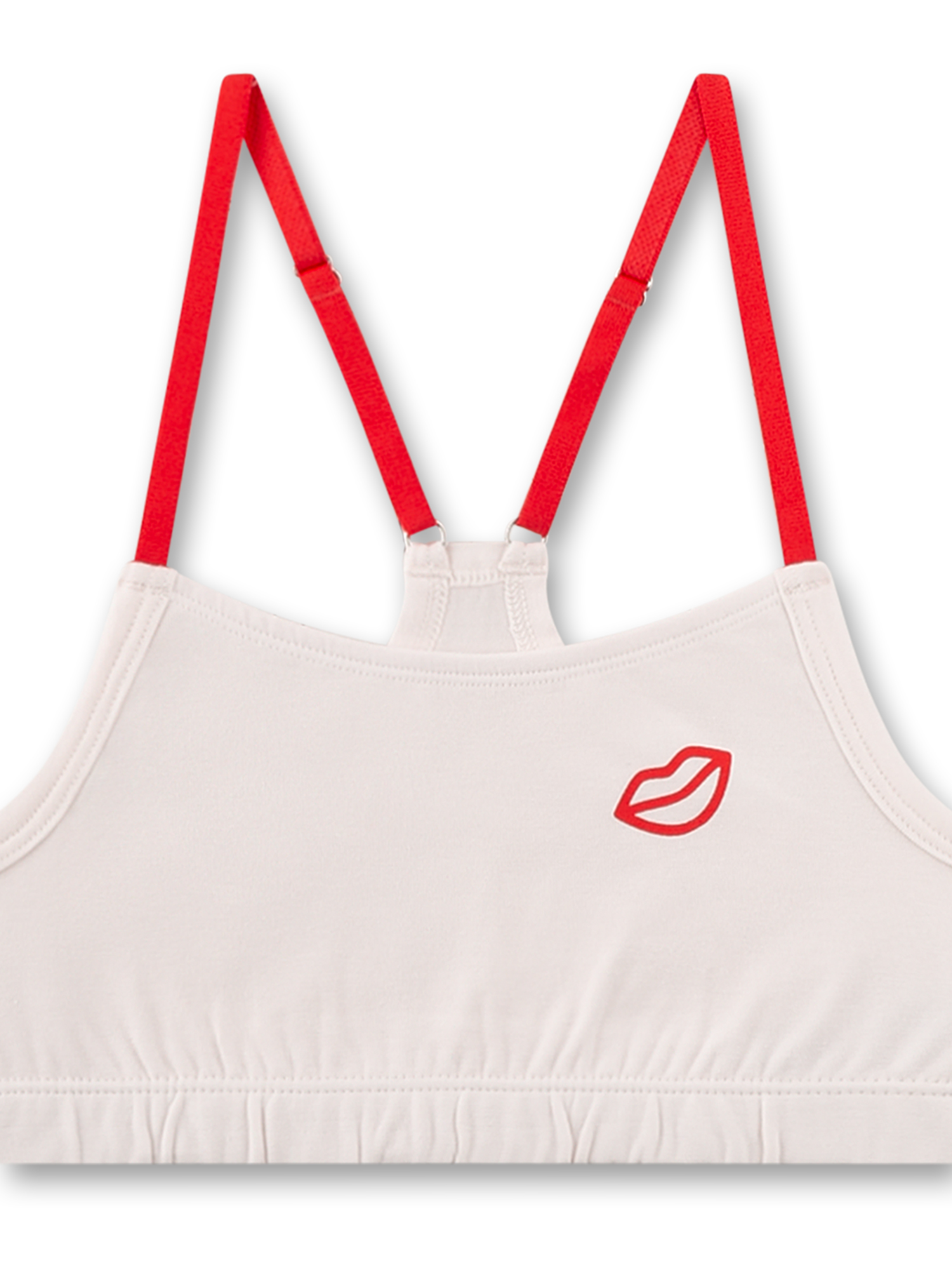 Das Mädchen-Bustier ist aus weichem, geschmeidigem Single Jersey mit 95 Prozent Baumwolle und 5 Prozent Elasthan gefertigt. Es ist elastisch, anschmiegsam und besonders angenehm zu tragen. Der breite, elastische Unterbrustbund sorgt für sicheren Halt und einen charmanten Akzent. Die verstellbaren Träger sind kräftig rot und verlaufen im sportlichen Racerback-Stil. Der Rücken ist mittig frei ausgeschnitten und bietet luftig-leichten Komfort sowie viel Bewegungsfreiheit. Auf der Vorderseite befindet sich als liebevolles Detail ein kleiner, frecher roter Kussmund-Print. Das Bustier ist perfekt für aktiven Alltag und stilbewusste Mädchen.