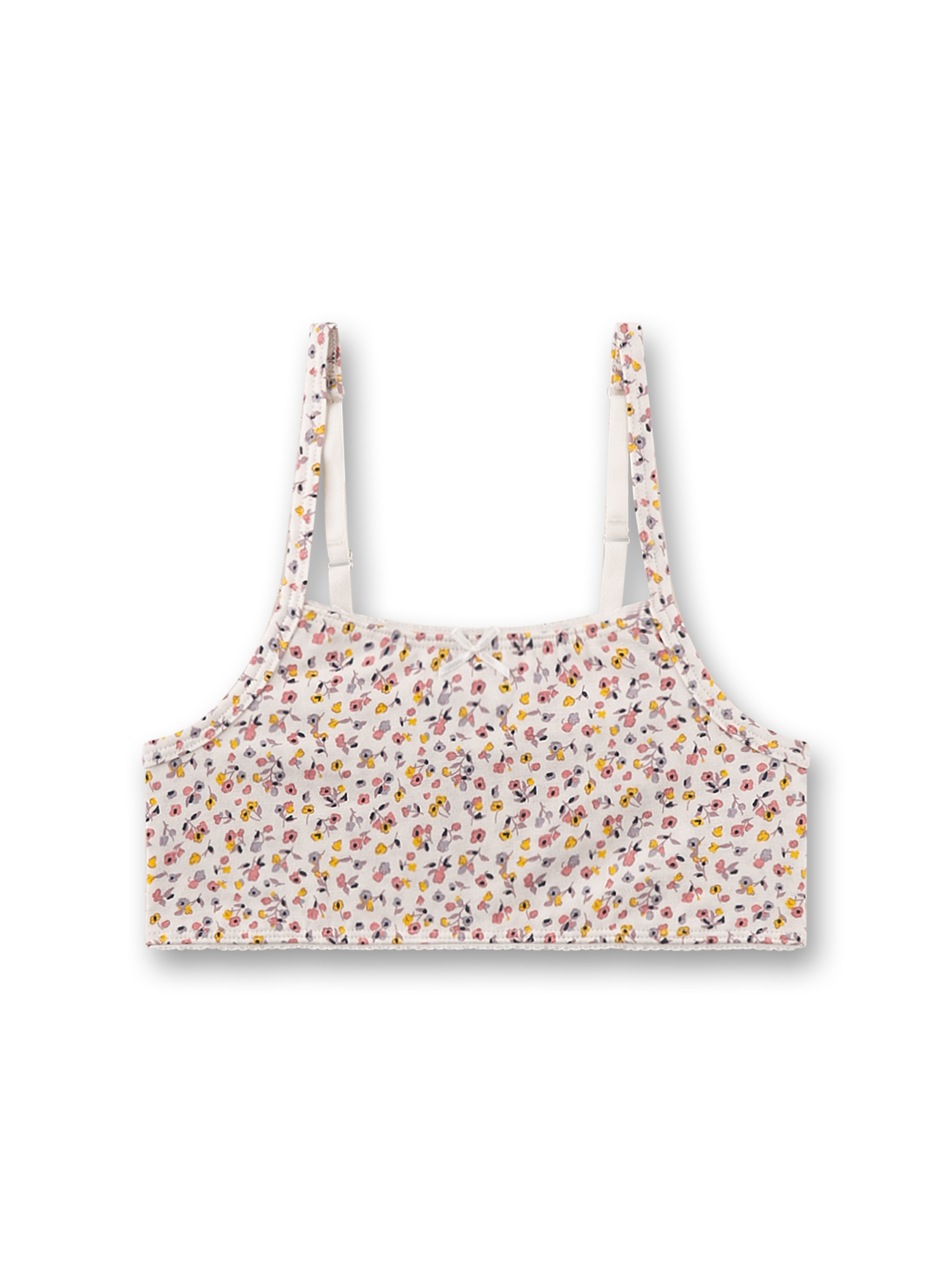 Dieses verspielte Doppelpack Mädchen-Bustiers aus Single Jersey mit 47 % Baumwolle, 47 % Modal und 6 % Elasthan ist kuschelig weich, federleicht und angenehm anschmiegsam. Die verstellbaren Träger sorgen für einen perfekten, sanften Sitz. Das fröhliche Allover-Muster zeigt viele kleine bunte Blümchen und Blätter auf hellem Grund. Eine zarte weiße Schleife mit Spitzenborte am Ausschnitt setzt einen charmanten, verspielten Akzent, während der untere Saum mit einer feinen Spitzenkante hübsch gewellt ist. Sanft zur Haut, komfortabel und ideal für kleine Mädchen, die liebevolle Details mögen.
