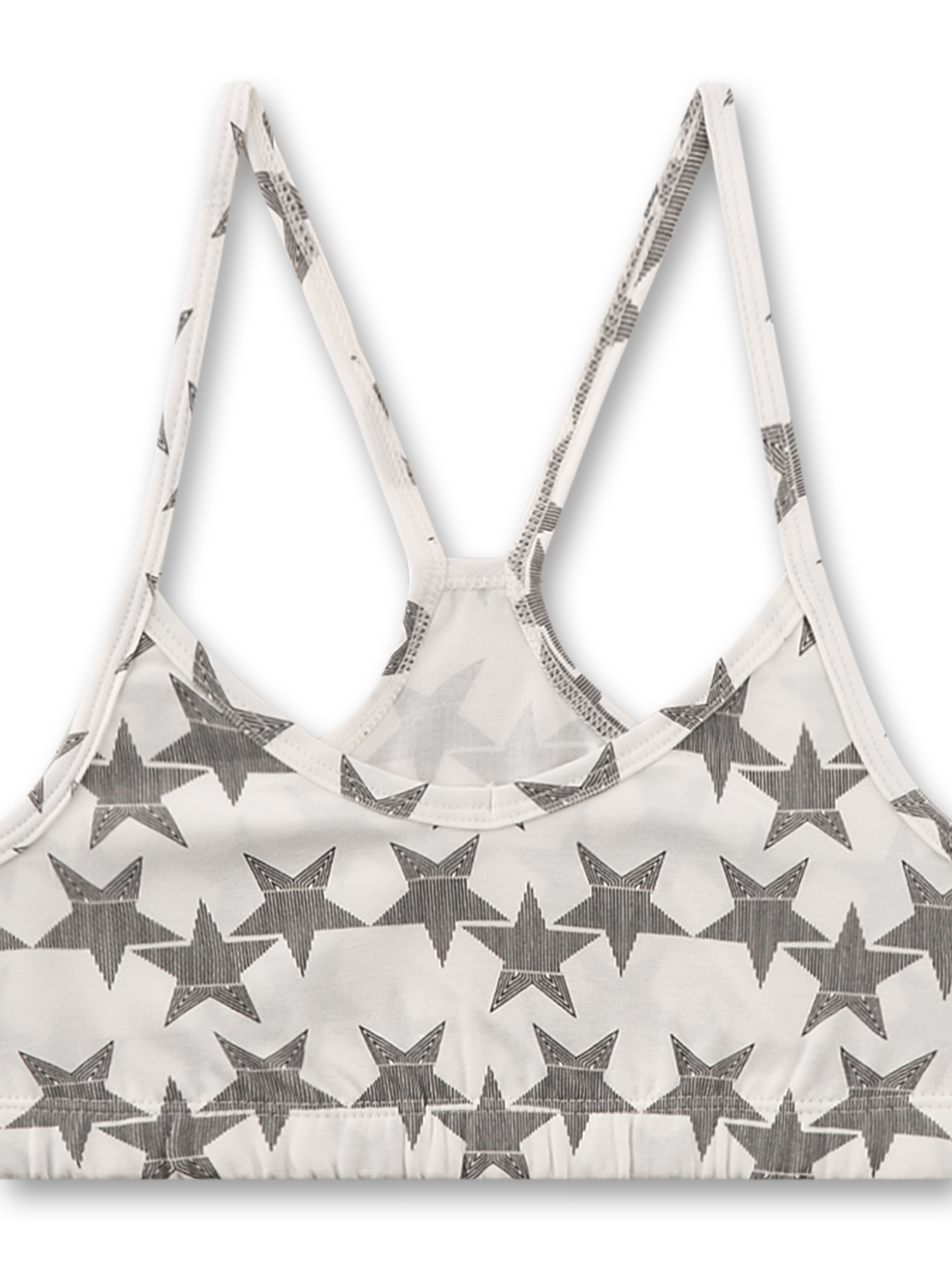 Das Mädchen-Bustier Sternen-Alloverdruck auf weißem Hintergrund bietet einen modischen und femininen Look! Der tonal abgesetzte Einfass am Träger und Ausschnitt sorgt für einen harmonischen Stil, während der modisch feminine Rückenausschnitt mit zarten Spaghettiträgern höchsten Tragekomfort garantiert. Das Bustier schmiegt sich optimal an deine Körperform an und bietet ein angenehmes Tragegefühl dank des elastischen Baumwollmixes.