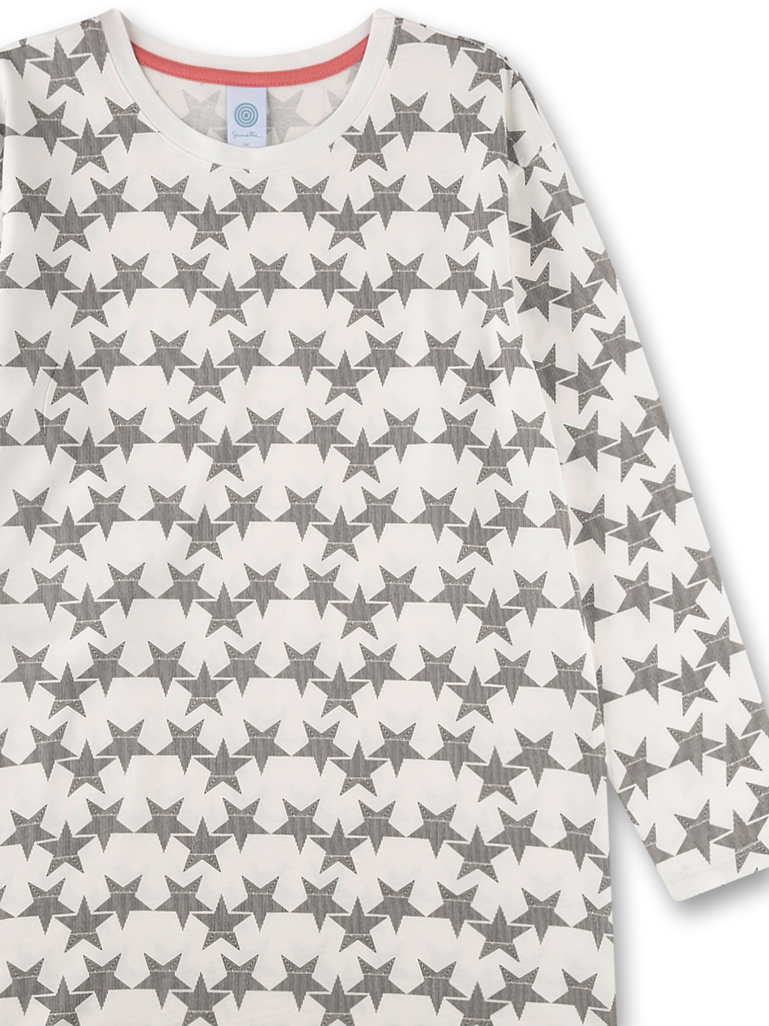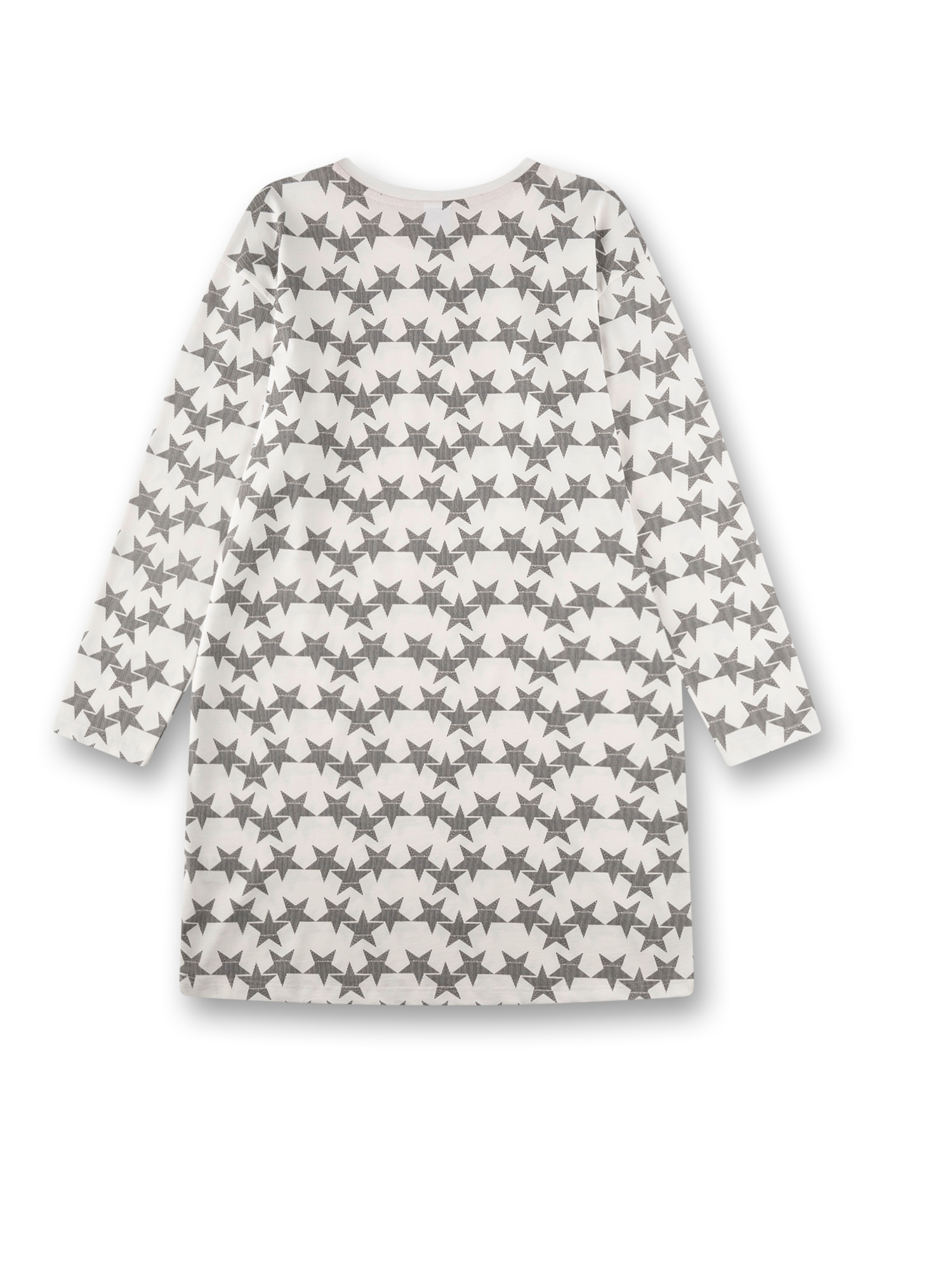 Dieses Mädchen-Nachthemd besteht aus 100 % weicher Baumwolle und überzeugt durch einen lockeren, bequemen Schnitt. Der weiße Grundton ist mit einem großflächigen, grauen Sternenmuster bedruckt, das gleichmäßig über das gesamte Nachthemd verteilt ist – ein modernes, kindgerechtes Design für kleine Träumerinnen.