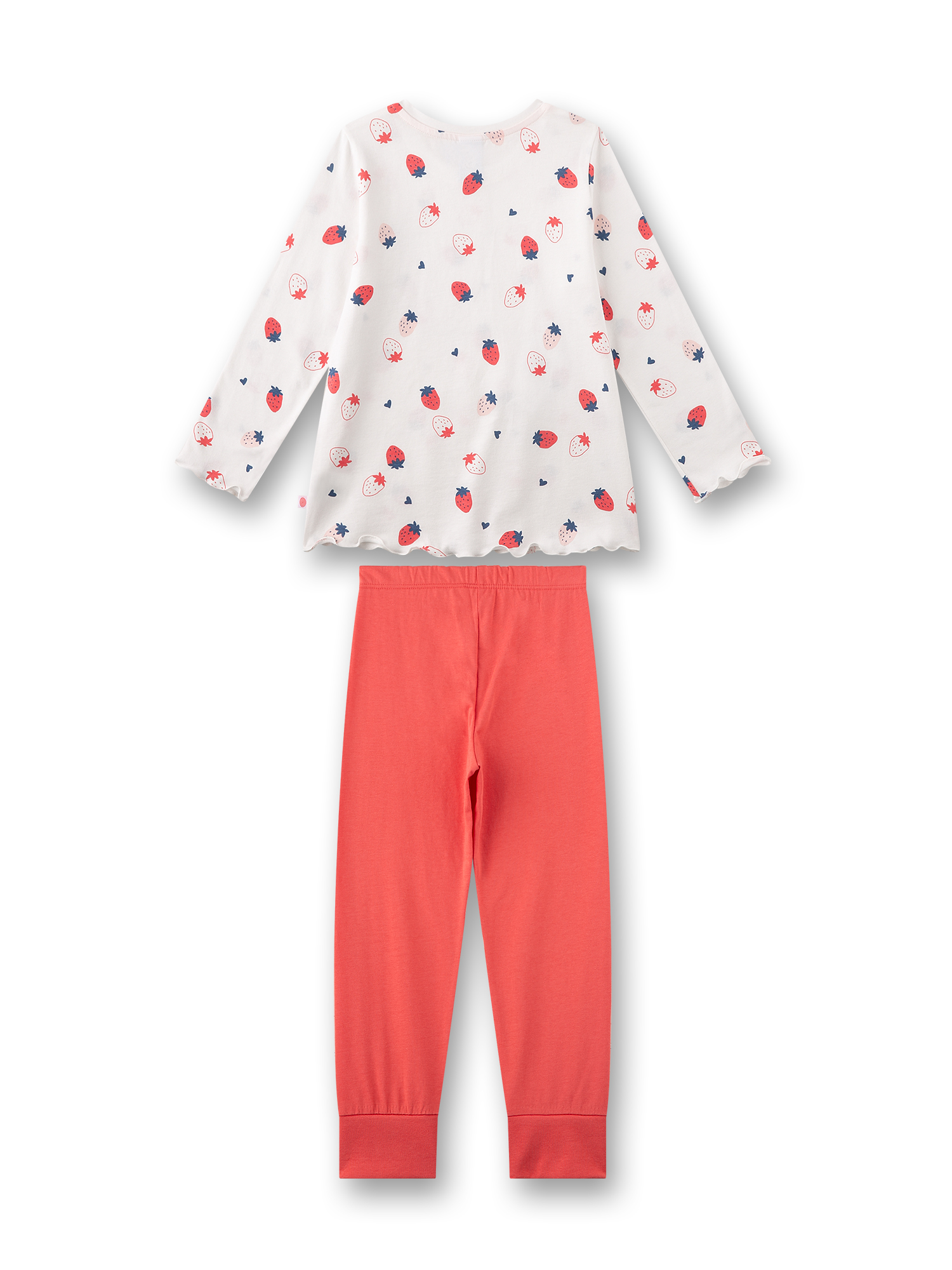 Dieser traumhafte Schlafanzug für Mädchen besteht aus 100 % weicher, hautfreundlicher Baumwolle und sorgt für süße Träume und höchsten Tragekomfort. Das langärmlige Oberteil zeigt sich in strahlendem Weiß mit einem fröhlichen Allover-Print aus roten und rosafarbenen Erdbeeren, ein fruchtig-verspielter Look, der gute Laune macht. Das Oberteil ist gerade geschnitten, hat einen klassischen Rundhalsausschnitt und wellige Abschlüsse an Ärmeln und Saum, die den mädchenhaften Stil perfekt unterstreichen. Die lange Hose greift den Farbton der rosafarbenen Erdbeeren auf und rundet das Outfit harmonisch ab. Dank elastischem Bund sitzt sie bequem und bietet viel Bewegungsfreiheit.