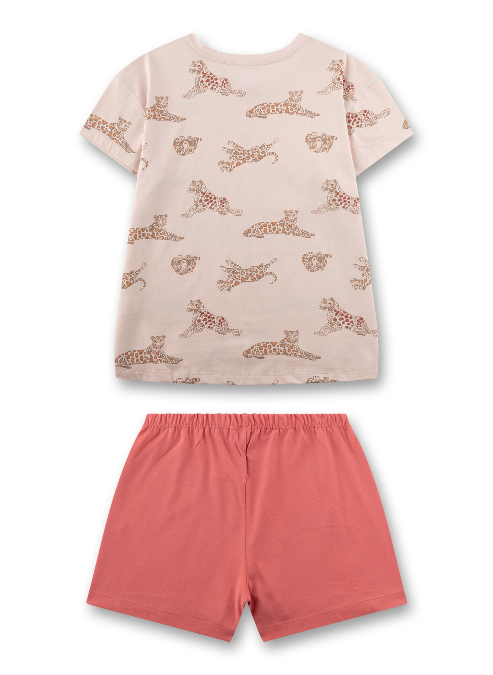 Tauche ein in die süße Welt des Schlafens mit unserem kürzeren Schlafanzug von Sanetta! Dieser bezaubernde Pyjama aus 100% Baumwolle ist das Nonplusultra an Komfort und Stil. Der zauberhafte Leo Alloverdruck auf softem Rosé Beige sorgt für einen Blickfang, während die Shorts in zartem Himbeerrot elegante Akzente setzen. Der Rundhalsausschnitt mit farblich abgesetztem Nackenband und die klassische, gerade Schnittform mit Kurzarm machen diesen Schlafanzug zu einem unverzichtbaren Begleiter für entspannte Nächte.