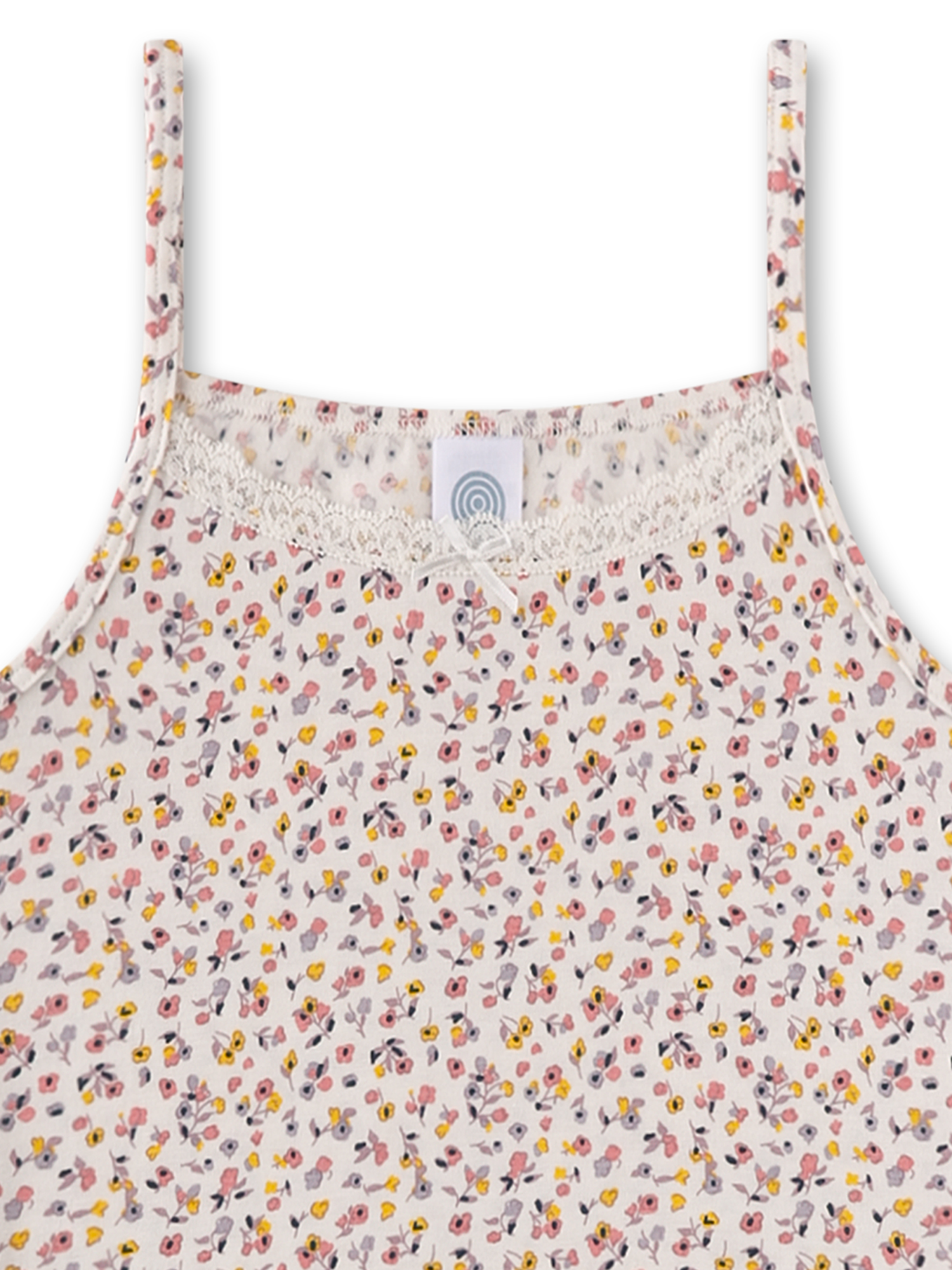 Dieses zauberhafte Mädchen-Unterhemd aus Single Jersey mit 47 % Baumwolle, 47 % Modal und 6 % Elasthan ist besonders weich, anschmiegsam und elastisch. Das hübsche Allover-Muster zeigt zahlreiche kleine, bunte Blumen und Blätter, die fröhlich über den gesamten Stoff verteilt sind. Am Ausschnitt sitzt eine zarte Schleife mit Spitzenborte, der wellige Saum am unteren Rand verleiht dem Unterhemd eine liebenswerte, verspielte Note. Sanft zur Haut, komfortabel und perfekt für kleine Mädchen im Alltag.