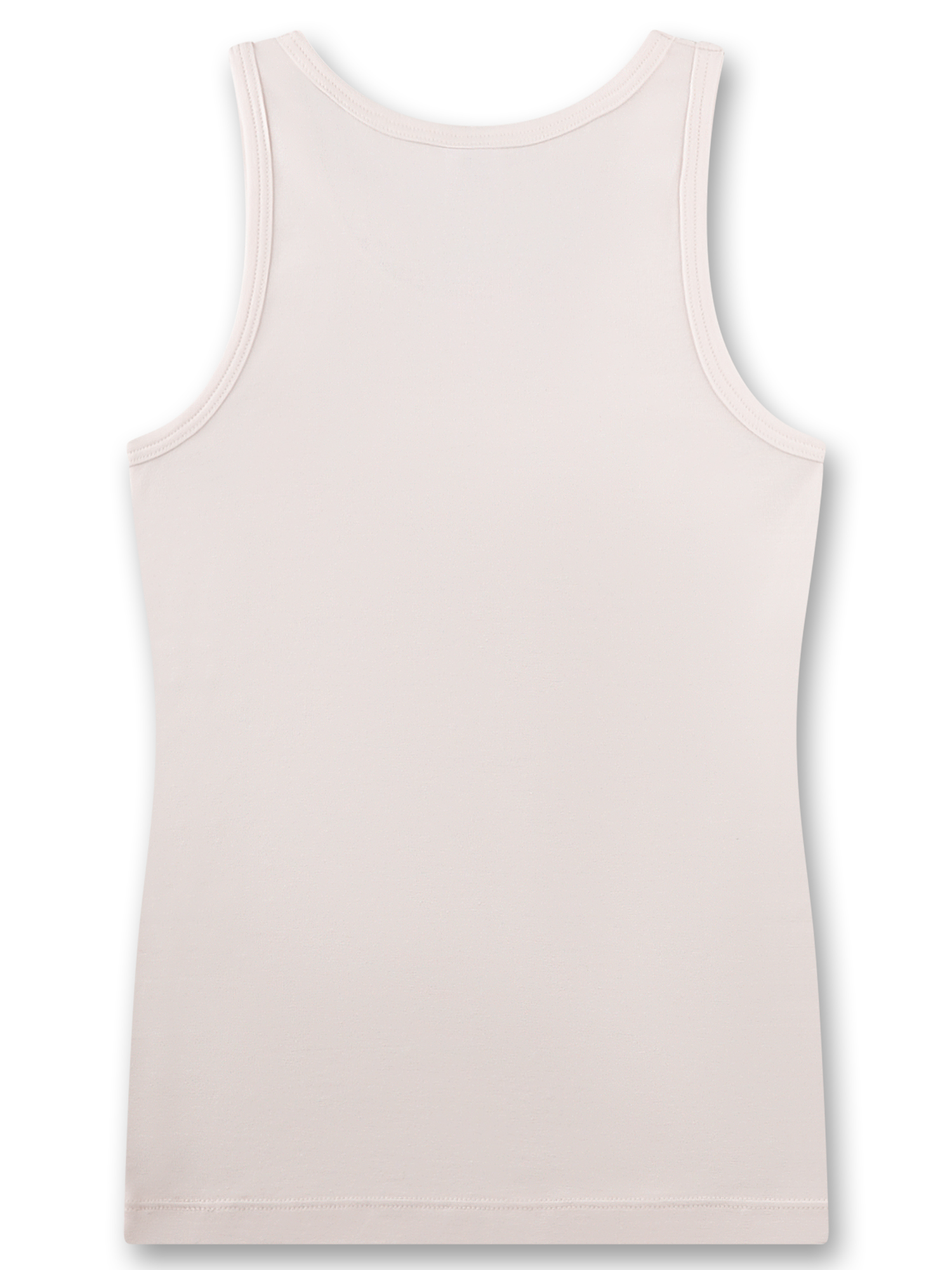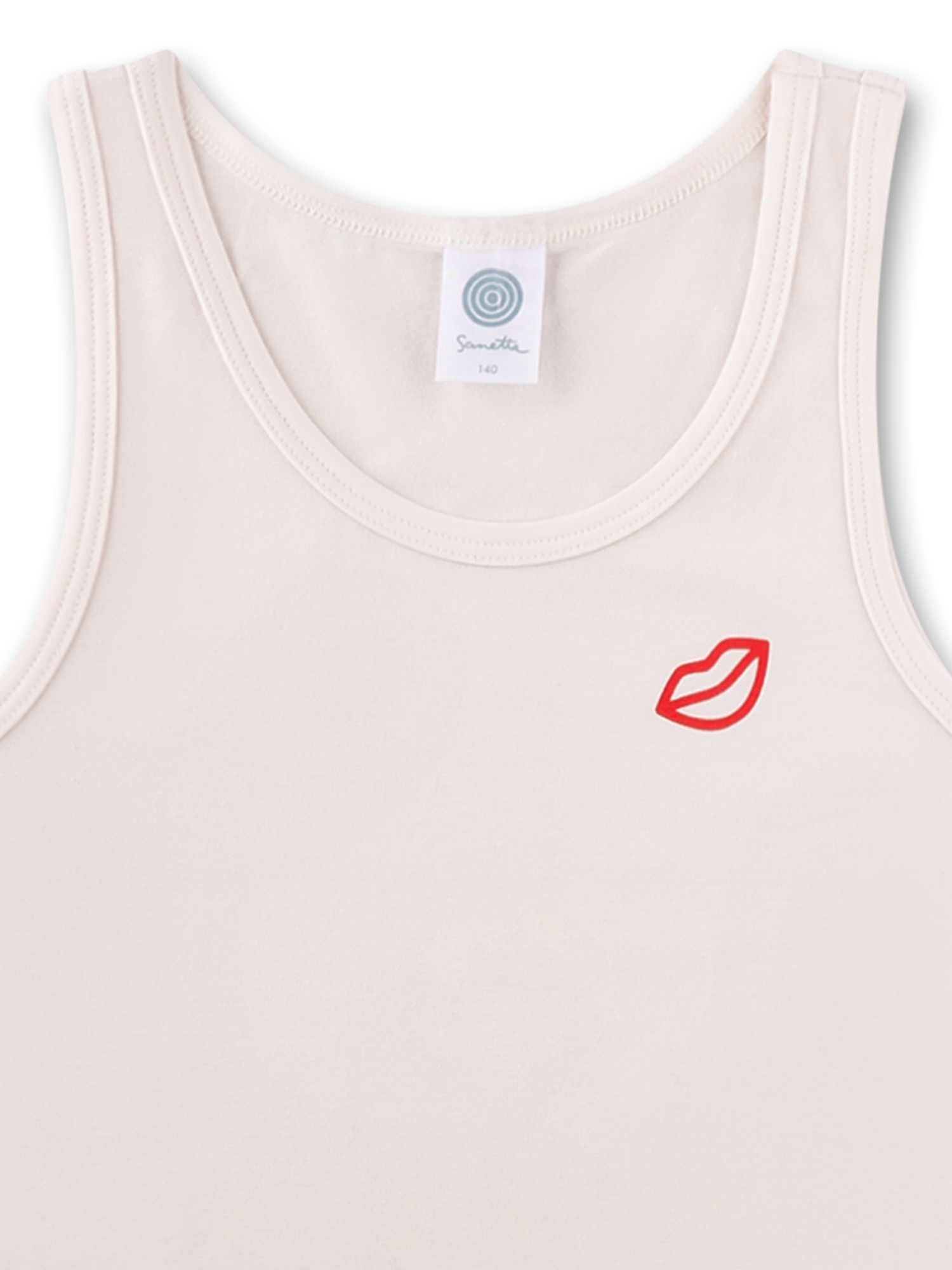 Das Mädchen-Unterhemd ist aus Single Jersey mit 95 Prozent Baumwolle und 5 Prozent Elasthan gefertigt. Es ist weich, elastisch und angenehm zu tragen. Das Unterhemd ist in einem zarten, hellen Farbton gehalten und schlicht gestaltet. Als verspieltes Detail befindet sich links auf der Brust ein kleiner roter Kussmund-Print. Der Schnitt ist klassisch mit Rundhalsausschnitt und breiten Trägern. Das Unterhemd ist ideal für jeden Tag und bietet besonders hohen Tragekomfort.