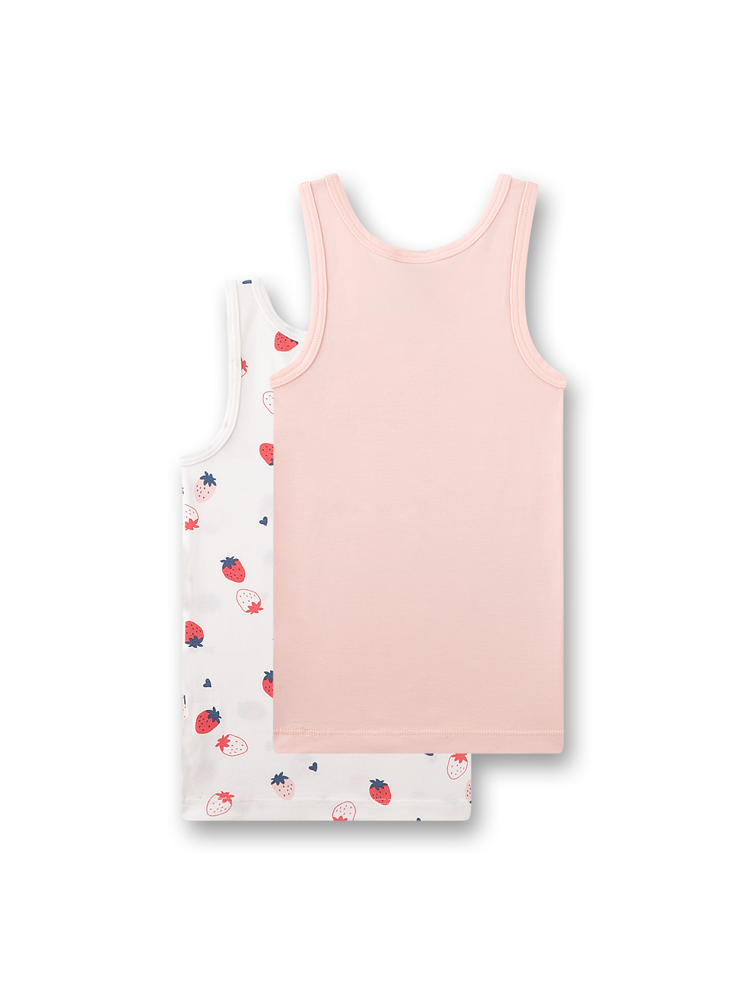 Dieses fröhliche Doppelpack Mädchen-Unterhemden aus Single Jersey mit 95 % Baumwolle und 5 % Elasthan ist weich, anschmiegsam und dehnbar. Ein Hemd ist zartes Rosa, das andere Weiß mit einem lebhaften Allover-Muster. Leuchtend rote und pinke Erdbeeren, kleine dunkelblaue Herzen und Blätter sorgen für einen frischen, verspielten Look. Beide Hemden sind am Ausschnitt mit einer kleinen Schleife verziert und verleihen jedem einen charmanten Akzent. Sanft zur Haut, bequem und ideal für jeden Tag.