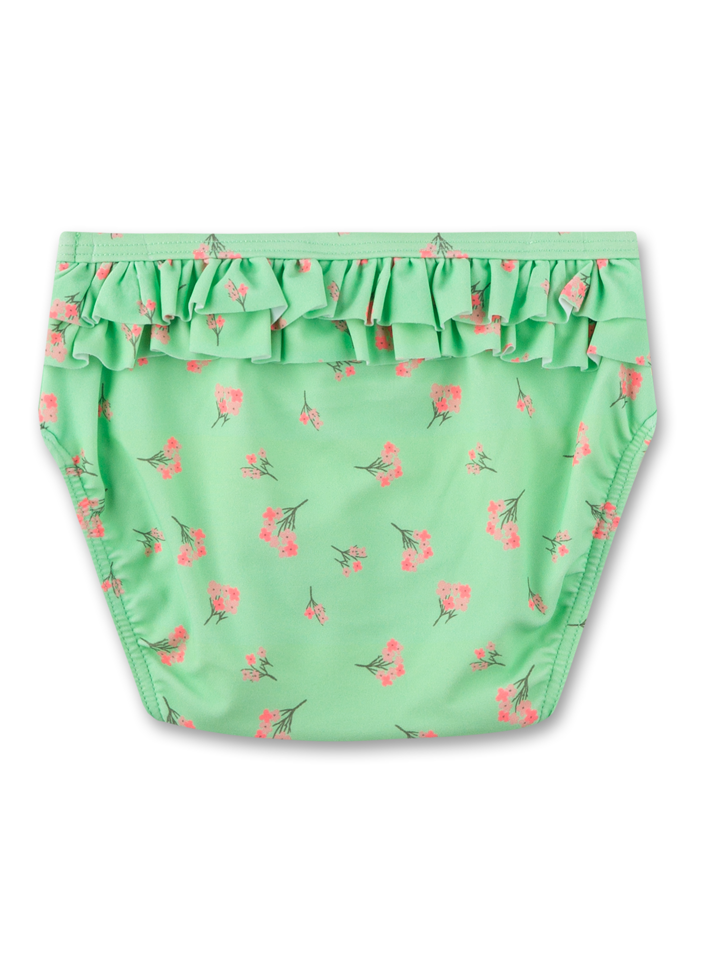 Verspielte Schwimmwindel für Mädchen in einem frischen Grün mit rosa Blumen von Sanetta.
