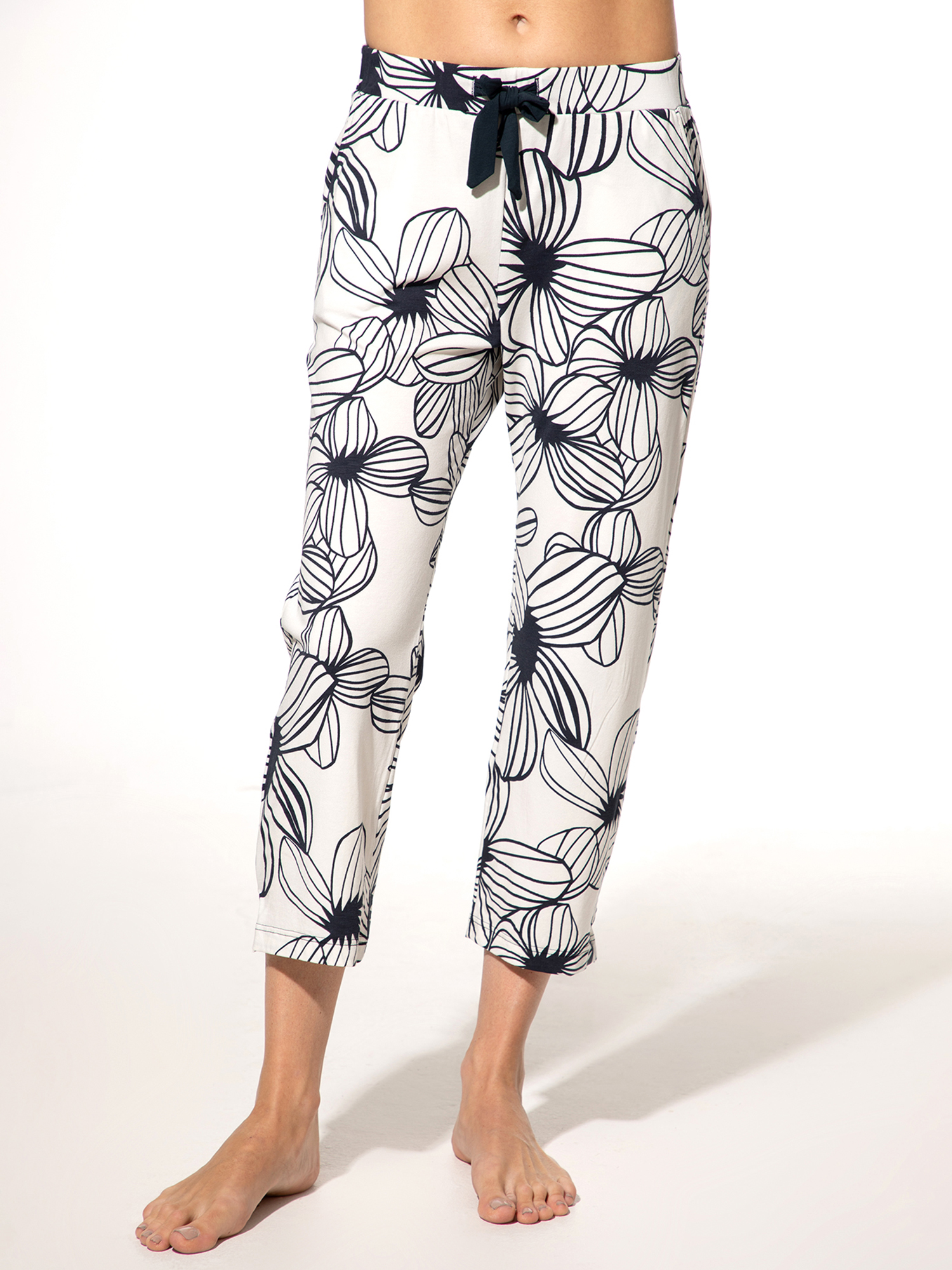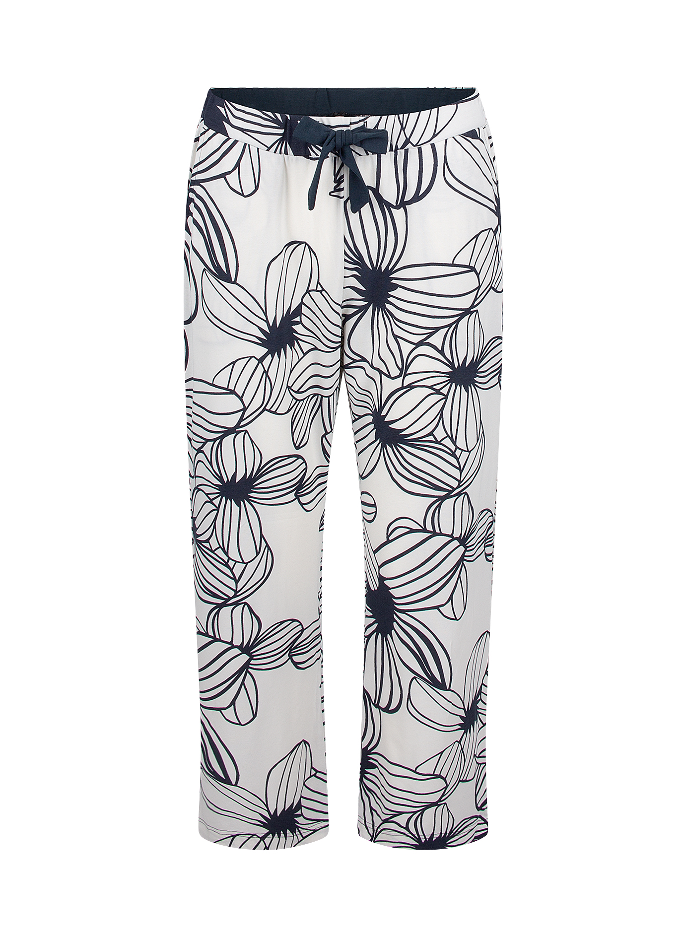 Diese lange Schlafhose für Damen in Off-White mit dunkelblauem Blumenmuster bietet höchsten Komfort und einen eleganten Look. Gefertigt aus elastischem Single Jersey mit 95% Baumwolle und 5% Elasthan, fühlt sie sich angenehm weich an und ermöglicht viel Bewegungsfreiheit. Der elastische Taillenbund ist mit einer dekorativen Schleife verziert. Die 7/8-Länge und die kleinen Schlitze an den Beinenden sorgen für einen modernen Touch. Ideal für gemütliche Nächte, in denen Sie sich rundum wohlfühlen möchten.