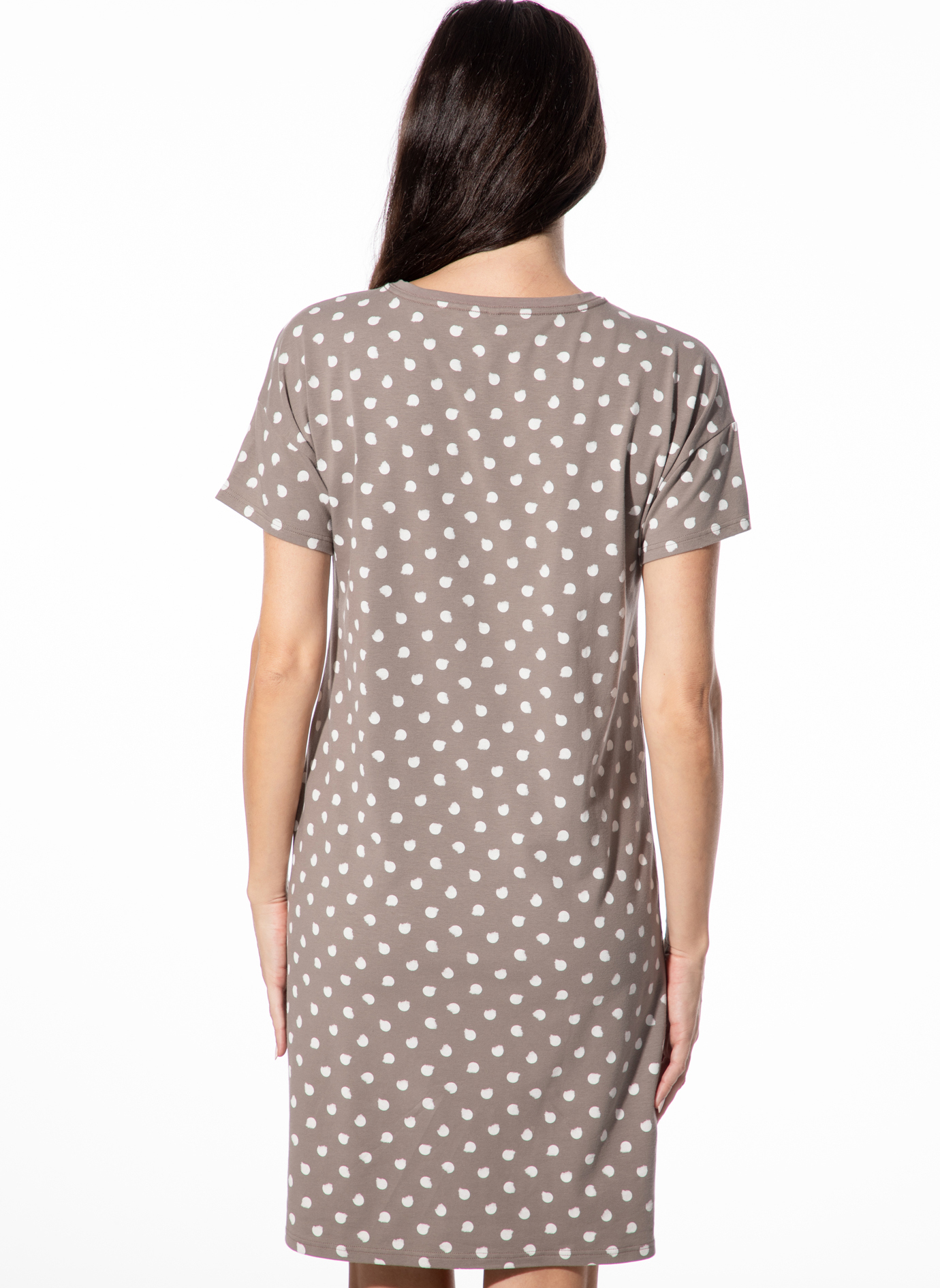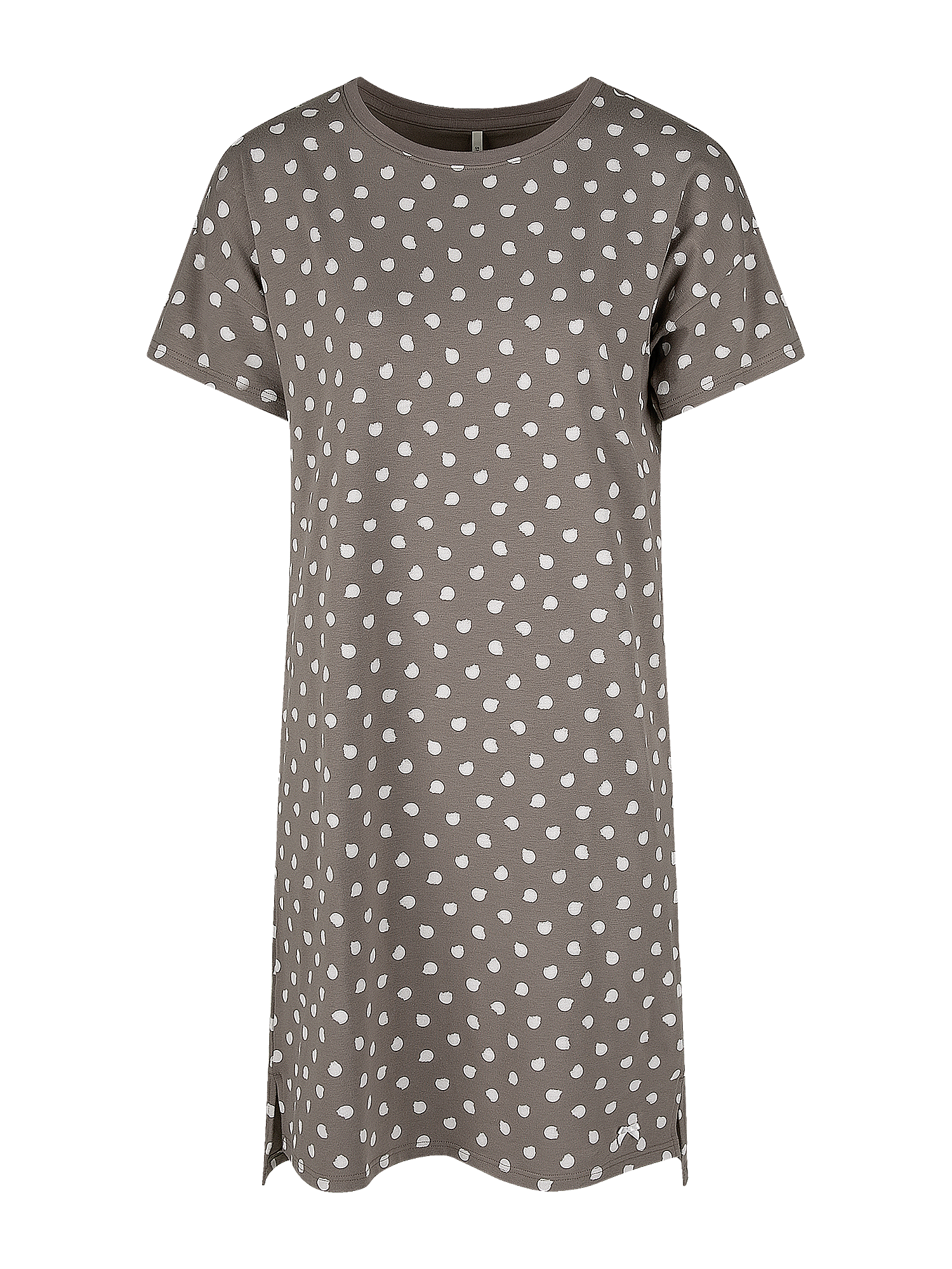 Das Damen-Nachthemd in Ela Single Qualität von SHORT STORIES steht für erstklassige Verarbeitung. Aus 95 % weicher Baumwolle und Elasthan gefertigt, schenkt es außergewöhnlichen Tragekomfort und fühlt sich sanft auf der Haut an. Überschnittene Schultern, ein längerer Rundhalsausschnitt und die moderne, etwas längere Rückenpartie umspielen elegant die Silhouette. Seitliche Schlitze sorgen für Bewegungsfreiheit, während das braune Punktmuster mit zarter Schleife am linken Saum charmante Akzente setzt. Ein Nachthemd, das Stil, Komfort und hochwertige Qualität harmonisch vereint und perfekt für entspannte Nächte und gemütliche Stunden ist.