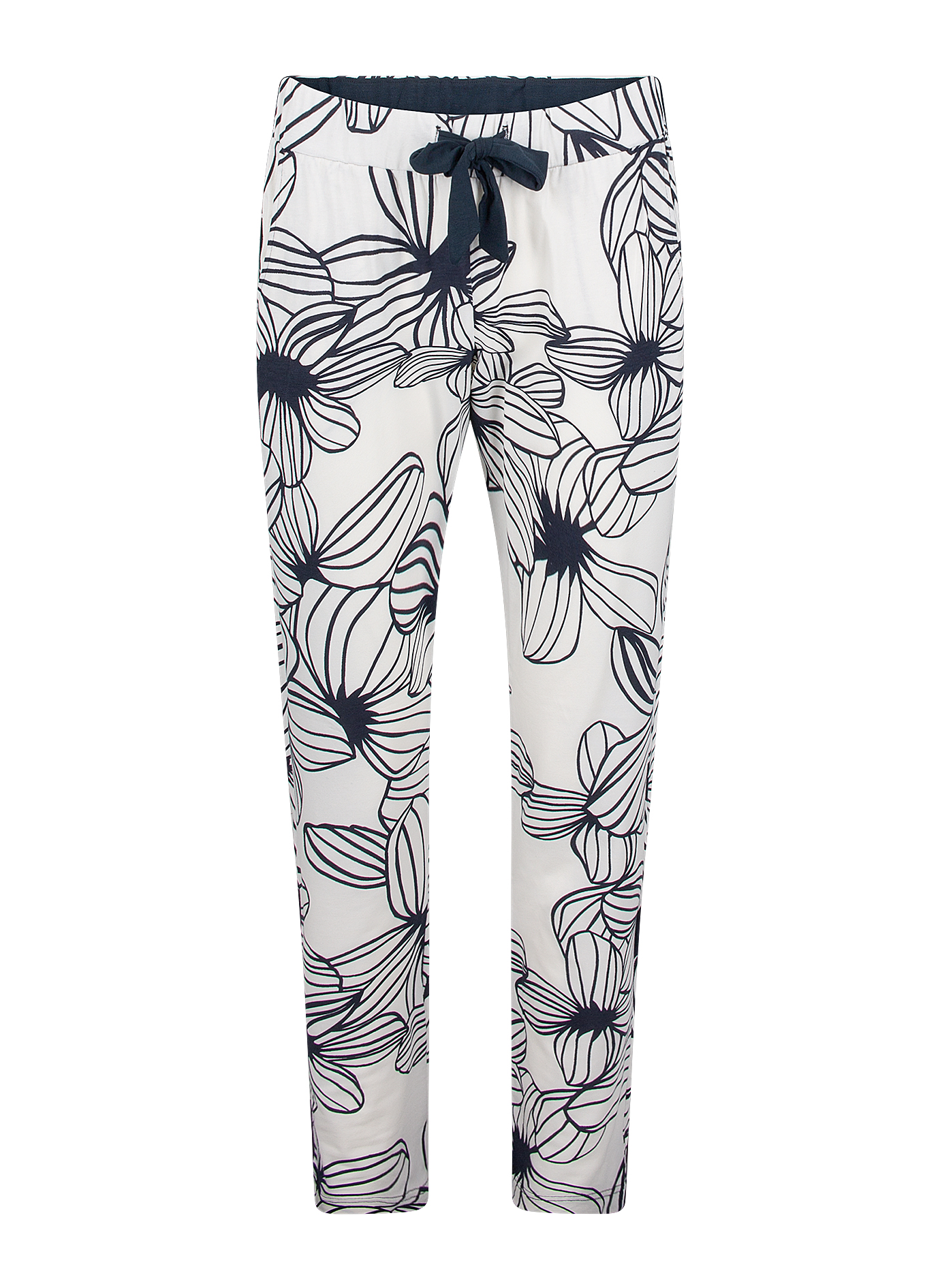 Diese lange Schlafhose für Damen in Off-White mit einem floralen Muster in Dunkelblau besticht durch ihre äußerst bequeme Passform. Hergestellt aus elastischem Single Jersey mit 95% Baumwolle und 5% Elasthan, fühlt sie sich angenehm weich an und bietet ausreichend Bewegungsfreiheit für einen guten Schlaf. Der elastische Taillenbund ist mit einer charmanten Zierschleife verziert. Die Hose verjüngt sich zum Beinende hin, was für eine schmale, moderne Passform sorgt. Ein perfektes Stück für gemütliche Nächte, das sowohl bequem als auch feminin ist.