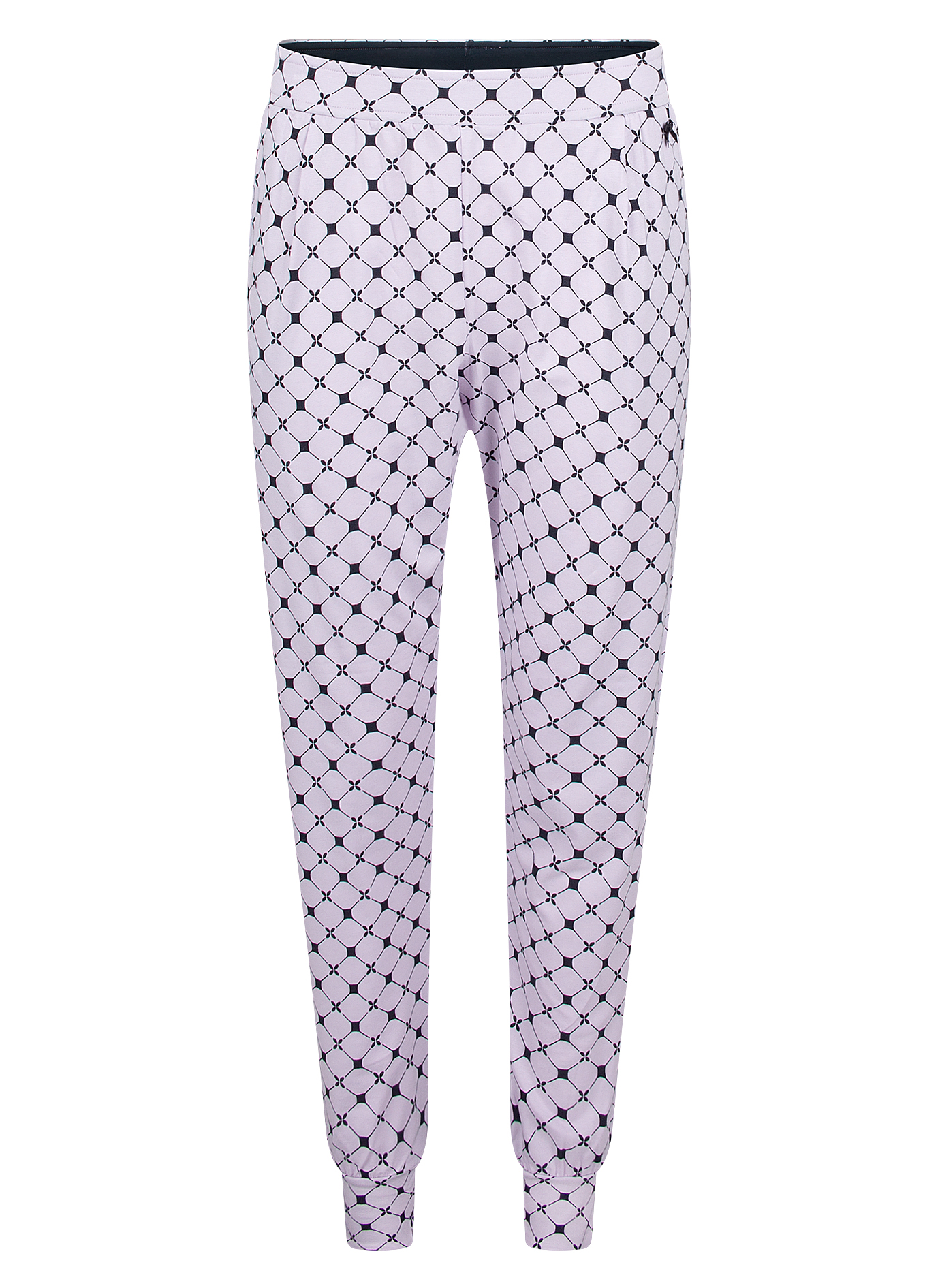 Diese rosa Schlafhose mit schwarzem Rautenmuster ist der ideale Begleiter für entspannte Nächte mit einem Hauch Eleganz. Hergestellt aus elastischem Single Jersey mit 47% Baumwolle, 47% Modal und 6% Elasthan, bietet sie ein weiches, anschmiegsames Tragegefühl und eine perfekte Passform. Der elastische Taillenbund und die breiten Bündchen am Beinsaum sorgen für hohen Komfort und sicheren Halt. Ein charmantes Detail ist die kleine dekorative Schleife auf der linken Vorderseite unter dem Saum. Kombinieren Sie die Hose idealerweise mit dem passenden Schlaf-Hemd für einen harmonischen Look.